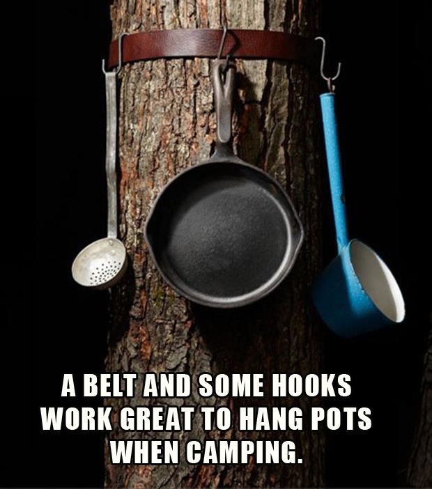 Use a belt and hooks to hang pots and utensils off a tree or pole when camping.