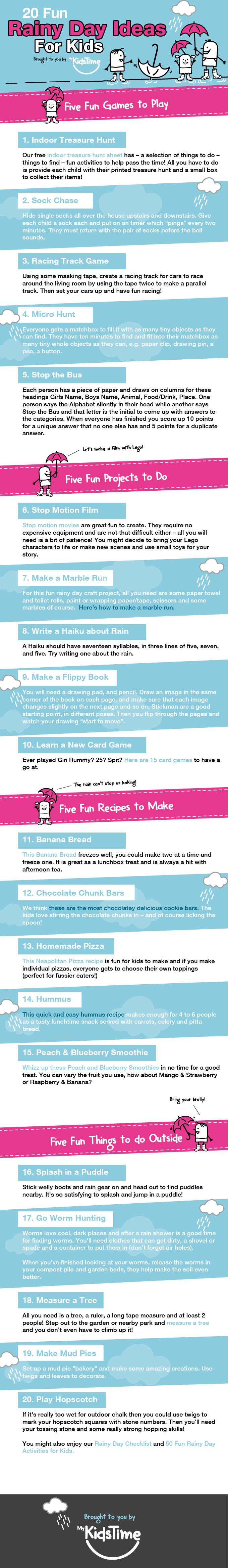 Stuck inside on a rainy day with the kids? Kids saying I’m Bored? Fear not as we have created this fun infographic for parents with ideas for 20 terrific rainy day activities for kids.